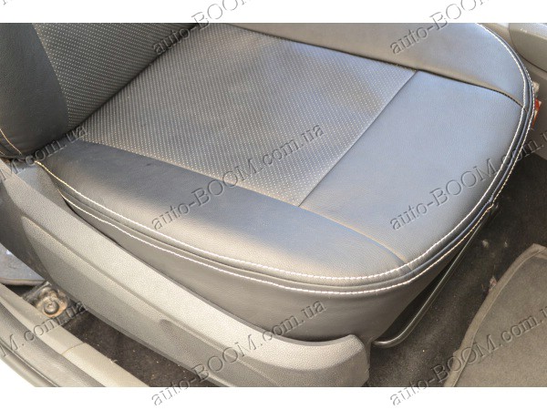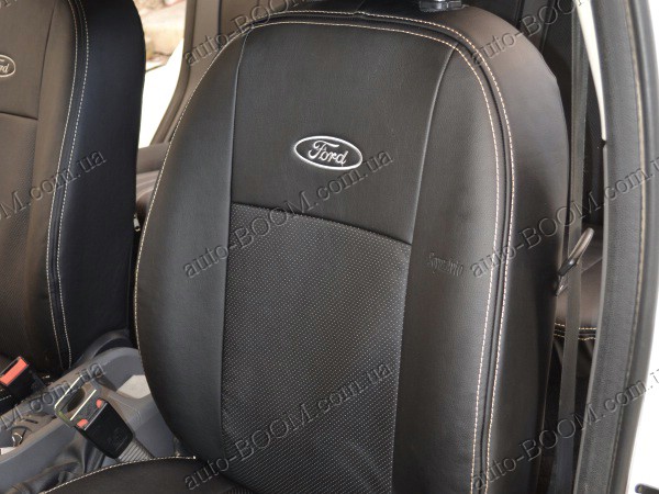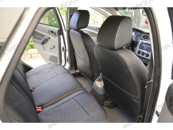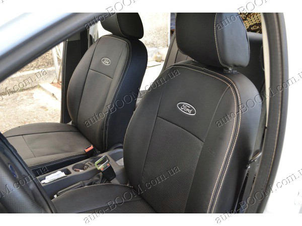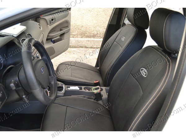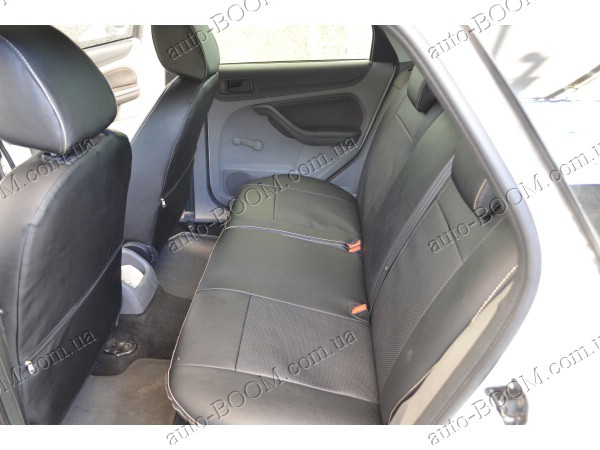 Автомобильные чехлы из экокожи Ford Focus 3 Sport+ 11- хэтчбек производятся украинской компанией Союз-Авто, пошиты из высококачественного экологически чистого кожзаменителя Аригон и экокожи. Данный материал легко поддается чистке обычными чистящими средствами, имеет отличную вентилируемую функцию. Из характеристик авточехлов следует выделить то, что задняя часть и передняя спинка закрыта, одевается мешком без резинок. Крепление осуществляется с помощью липучек на задние и передние спинки, а сведение крепится с помощью веревки. В подголовниках имеются специальные отверстия.