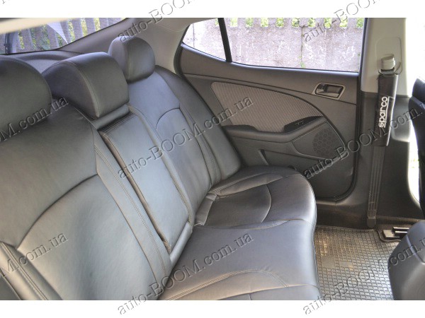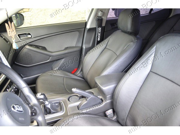 Автомобильные чехлы из экокожи Kia Optima 10-16- производятся украинской компанией Союз-Авто, пошиты из высококачественного экологически чистого кожзаменителя Аригон и экокожи. Данный материал легко поддается чистке обычными чистящими средствами, имеет отличную вентилируемую функцию. Из характеристик авточехлов следует выделить то, что задняя часть и передняя спинка закрыта, одевается мешком без резинок. Крепление осуществляется с помощью липучек на задние и передние спинки, а сведение крепится с помощью веревки. В подголовниках имеются специальные отверстия.