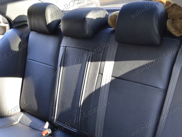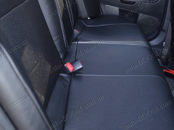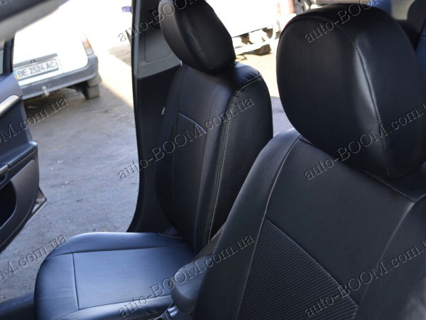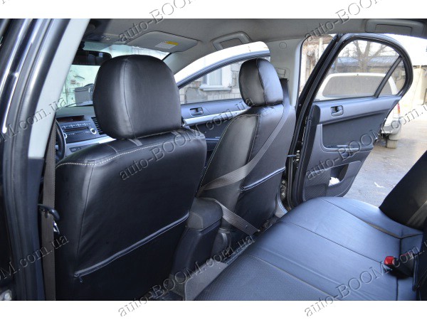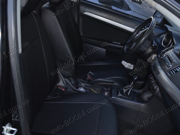 Автомобильные чехлы из экокожи Mitsubishi Lancer X 10 07-11 производятся украинской компанией Союз-Авто, пошиты из высококачественного экологически чистого кожзаменителя Аригон и экокожи. Данный материал легко поддается чистке обычными чистящими средствами, имеет отличную вентилируемую функцию. Из характеристик авточехлов следует выделить то, что задняя часть и передняя спинка закрыта, одевается мешком без резинок. Крепление осуществляется с помощью липучек на задние и передние спинки, а сведение крепится с помощью веревки. В подголовниках имеются специальные отверстия.