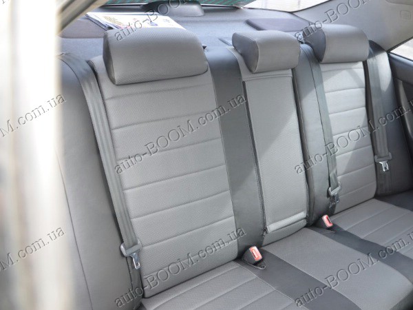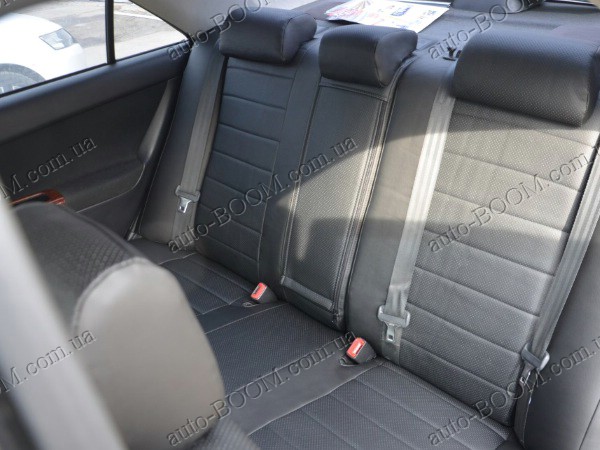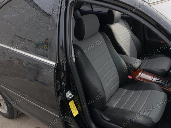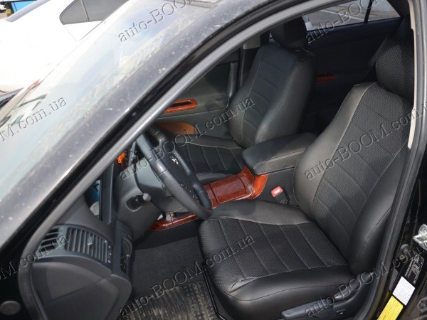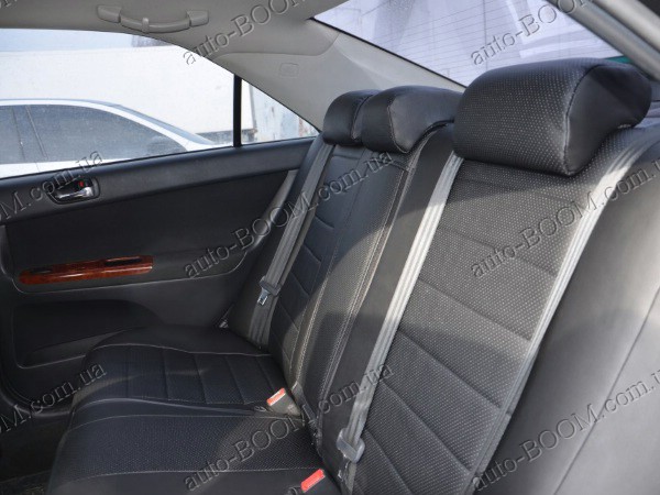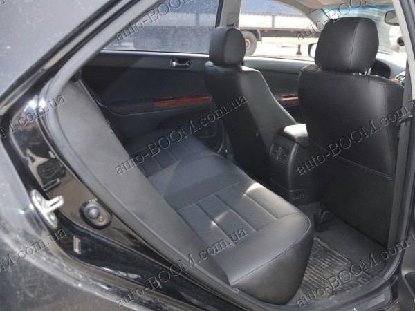 Автомобильные чехлы из экокожи Toyota Camry 30 01-06 производятся украинской компанией Союз-Авто, пошиты из высококачественного экологически чистого кожзаменителя Аригон и экокожи. Данный материал легко поддается чистке обычными чистящими средствами, имеет отличную вентилируемую функцию. Из характеристик авточехлов следует выделить то, что задняя часть и передняя спинка закрыта, одевается мешком без резинок. Крепление осуществляется с помощью липучек на задние и передние спинки, а сведение крепится с помощью веревки. В подголовниках имеются специальные отверстия.