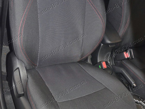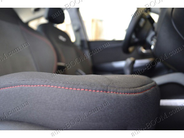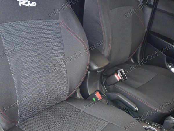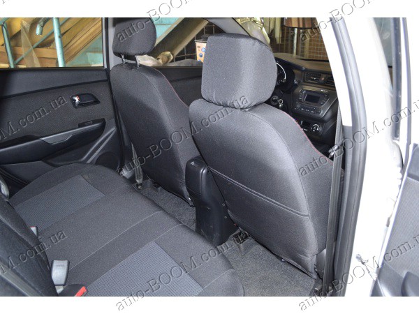 Автомобильные чехлы тканевые Kia Rio 11- производятся украинской компанией Союз-Авто. Пошиты из высокоэластичной ткани жаккард. Данный материал легко поддается чистке обычными моющими средствами, хорошо пропускает воздух. Из характеристик авточехлов следует выделить то, что задняя часть и передняя спинка закрыта, одевается мешком без резинок. Крепление осуществляется с помощью липучек на задние и передние спинки, а сведение крепится с помощью веревки. В подголовниках имеются специальные отверстия.