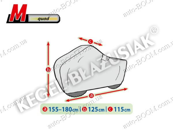 Чехол-тент для квадроцикла M Quad производится TM Kegel. Изготовлены из водонепроницаемого материала с системой микропор и вентиляционных отверстий, отводящих влагу из под чехла. Имеет конструкцию, которая может эффективно защитить весь мотоцикл. Чехлы для мотоцикла KEGEL-BLAZUSIAK самый надежный выбор для защиты данного вида транспорта, т. к. он гарантирует полную поддержку его в чистоте и предотвращение в появлении ржавчин. Чехол устойчив к ветру, снегу, инею, кислотным дождям, птичьему помёту, древесным сокам и солнечному излучению(UV). Высококачественный полипропилен с мягкой внутренней отделкой является залогом предупреждения всевозможных царапин на мотоцикле. Крепление осуществляется стандартным образом, по нижнему краю тента встроен шнур для связывания. Состав ткани:100% PP+PE.