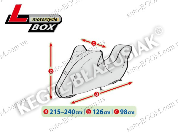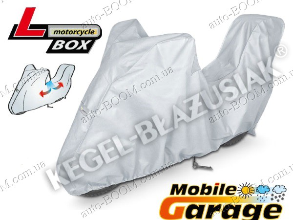 Чехол-тент для мотоцикла L+Box Motorcycle производится TM Kegel. Изготовлены из водонепроницаемого материала с системой микропор и вентиляционных отверстий, отводящих влагу из под чехла. Имеет конструкцию, которая может эффективно защитить весь мотоцикл. Чехлы для мотоцикла KEGEL-BLAZUSIAK самый надежный выбор для защиты данного вида транспорта, т. к. он гарантирует полную поддержку его в чистоте и предотвращение в появлении ржавчин. Чехол устойчив к ветру, снегу, инею, кислотным дождям, птичьему помёту, древесным сокам и солнечному излучению(UV). Высококачественный полипропилен с мягкой внутренней отделкой является залогом предупреждения всевозможных царапин на мотоцикле. Крепление осуществляется стандартным образом, по нижнему краю тента встроен шнур для связывания. Состав ткани:100% PP+PE.