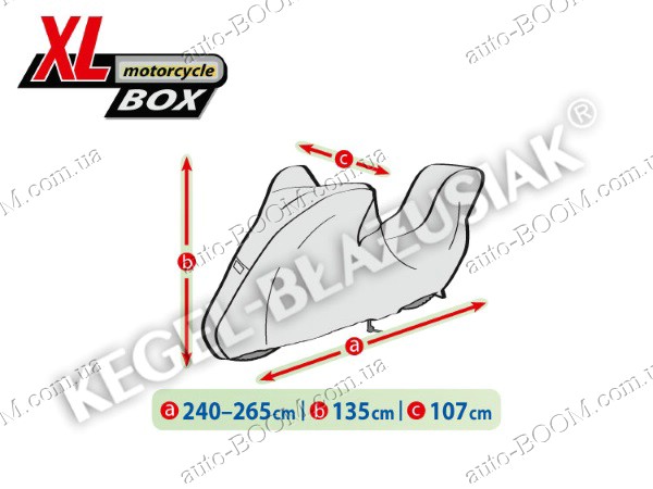 Чехол-тент для мотоцикла XL+Box Motorcycle производится TM Kegel. Изготовлены из водонепроницаемого материала с системой микропор и вентиляционных отверстий, отводящих влагу из под чехла. Имеет конструкцию, которая может эффективно защитить весь мотоцикл. Чехлы для мотоцикла KEGEL-BLAZUSIAK самый надежный выбор для защиты данного вида транспорта, т. к. он гарантирует полную поддержку его в чистоте и предотвращение в появлении ржавчин. Чехол устойчив к ветру, снегу, инею, кислотным дождям, птичьему помёту, древесным сокам и солнечному излучению(UV). Высококачественный полипропилен с мягкой внутренней отделкой является залогом предупреждения всевозможных царапин на мотоцикле. Крепление осуществляется стандартным образом, по нижнему краю тента встроен шнур для связывания. Состав ткани:100% PP+PE.