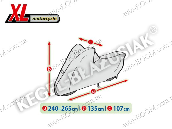 Чехол-тент для мотоцикла XL Motorcycle производится TM Kegel. Изготовлены из водонепроницаемого материала с системой микропор и вентиляционных отверстий, отводящих влагу из под чехла. Имеет конструкцию, которая может эффективно защитить весь мотоцикл. Чехлы для мотоцикла KEGEL-BLAZUSIAK самый надежный выбор для защиты данного вида транспорта, т. к. он гарантирует полную поддержку его в чистоте и предотвращение в появлении ржавчин. Чехол устойчив к ветру, снегу, инею, кислотным дождям, птичьему помёту, древесным сокам и солнечному излучению(UV). Высококачественный полипропилен с мягкой внутренней отделкой является залогом предупреждения всевозможных царапин на мотоцикле. Крепление осуществляется стандартным образом, по нижнему краю тента встроен шнур для связывания. Состав ткани:100% PP+PE.