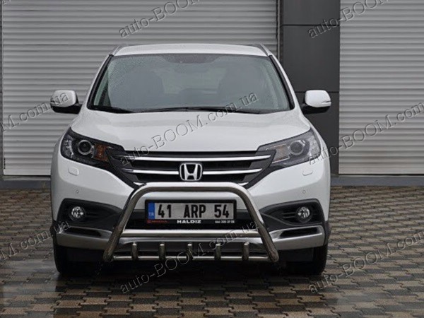 Кенгурятники на Honda CR-V 4 12- из нержавеющей качественной стали производство St-line (Турция). Такая конструкция состоит из спаянных труб и стержней. Крепятся в основном спереди, но реже сзади автомобиля. Предназначения кенгурятников в наше время, как защита кузова при езде по бездорожью. При неожиданном столкновении они уменьшат или смягчат удар от повреждения и деформации автомобиля. Кенгурятники служат не только, как защита, но и как прекрасный аксессуар для вашего авто, придавая солидный привлекательный внешний вид. Чаще всего используют такой аксессуар для джипов, микроавтобусов, пикапов. Купить и забрать данный товар на автомобиль Хонда СРВ 4 можно у нас в магазине лично или с доставкой по Украине.