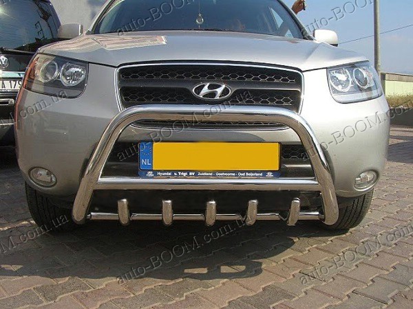 Кенгурятники на Hyundai Santa Fe 06-12 из нержавеющей качественной стали производство St-line (Турция). Такая конструкция состоит из спаянных труб и стержней. Крепятся в основном спереди, но реже сзади автомобиля. Предназначения кенгурятников в наше время, как защита кузова при езде по бездорожью. При неожиданном столкновении они уменьшат или смягчат удар от повреждения и деформации автомобиля. Кенгурятники служат не только, как защита, но и как прекрасный аксессуар для вашего авто, придавая солидный привлекательный внешний вид. Чаще всего используют такой аксессуар для джипов, микроавтобусов, пикапов. Купить и забрать данный товар на автомобиль Хендай Санта Фе можно у нас в магазине лично или с доставкой по Украине.