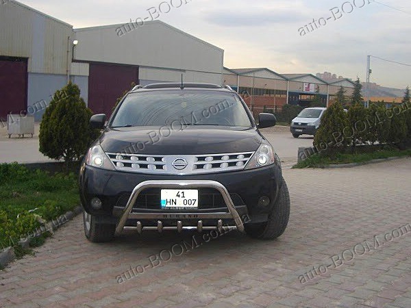 Кенгурятники на Nissan Murano 04-08 из нержавеющей качественной стали производство St-line (Турция). Такая конструкция состоит из спаянных труб и стержней. Крепятся в основном спереди, но реже сзади автомобиля. Предназначения кенгурятников в наше время, как защита кузова при езде по бездорожью. При неожиданном столкновении они уменьшат или смягчат удар от повреждения и деформации автомобиля. Кенгурятники служат не только, как защита, но и как прекрасный аксессуар для вашего авто, придавая солидный привлекательный внешний вид. Чаще всего используют такой аксессуар для джипов, микроавтобусов, пикапов. Купить и забрать данный товар на автомобиль Ниссан Мурано можно у нас в магазине лично или с доставкой по Украине.