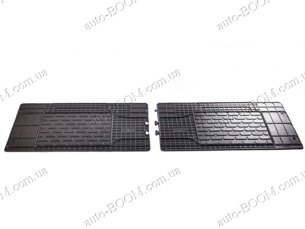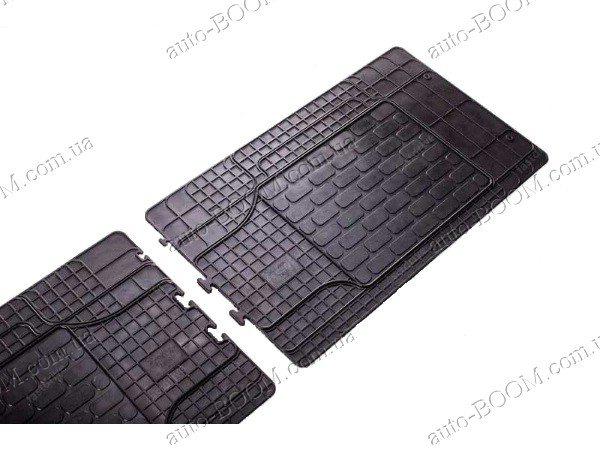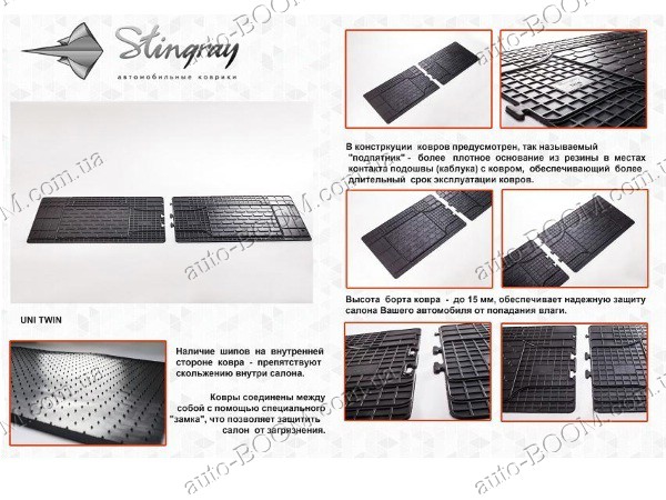 Резиновый универсальный коврик на второй и третий ряд сидений производится в Чехии на заводе Stingray. Для производства ковриков используется резина, она не выделяет запаха и не лопается на изломе. В конструкции ковров предусмотрен подпятник, более плотное основание из резины в местах контакта подошвы с ковром, обеспечивающий более длительный срок эксплуатации ковров. Высота борта ковра до 15 мм, обеспечивает надежную защиту салона автомобиля от попадания влаги. Наличие шипов на внутренний стороне ковра препятствуют скольжению внутри салона. Ковры соединены между собой с помощью замка. Размер 1550х450.