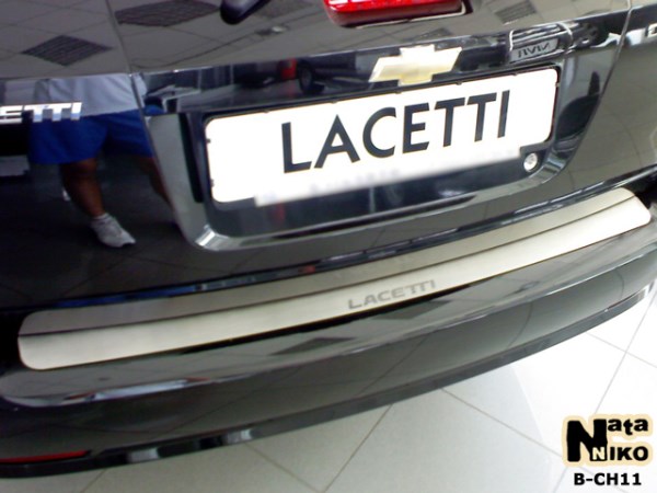 Накладка на бампер Chevrolet Lacetti 04- универсал производится украинской фирмой NataNiko. По желанию и совершенно БЕСПЛАТНО можем обклеить карбоновой пленкой. Материал - высоколегированная сталь толщиной 0,8мм. Устанавливается на обезжиренную поверхность с помощью двустороннего скотча ЗМ. Накладка бампера на Шевроле Лачетти особенно необходима для сохранения целостности лакокрасочного покрытия, так как багаж часто зацепляется и царапает краску, а порой даже приводит к сколам. Но благодаря такой защите бампера багажником можно пользоваться в полной мере и без опасения. К тому же эта накладка имеет красивый внешний вид, и станет хорошим дополнением экстерьера автомобиля.