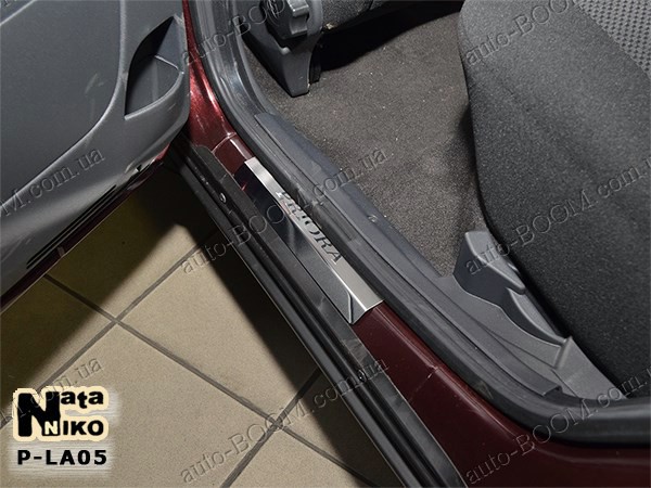 Накладки на пороги Лада Приора 2171, в комплекте 4 штуки. По желанию клиента их можно покрыть карбоновой пленкой. Эта услуга совершенно бесплатна. Данные аксессуары производятся фирмой NataNiko из высоколегированной нержавеющей стали, которую они получают от мировых производителей. Толщина накладки на пороги составляет 0,5 мм. Для их надежного и долговечного крепления используется двухсторонний скотч ЗМ. Он уже нанесен по внутреннему периметру.