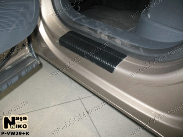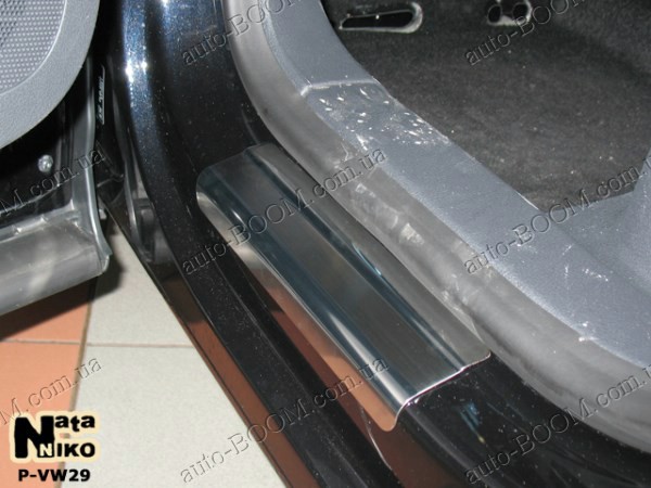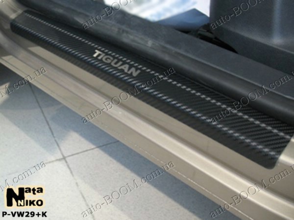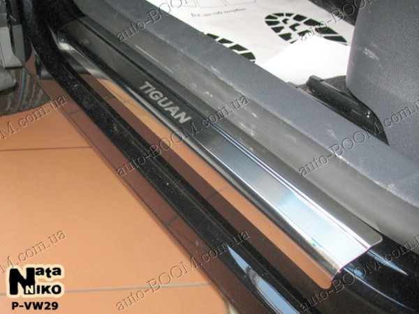 Накладки на пороги VW Tiguan 08-, в комплекте 4 штуки. По желанию клиента их можно покрыть карбоновой пленкой. Эта услуга совершенно бесплатна. Данные аксессуары производятся фирмой NataNiko из высоколегированной нержавеющей стали, которую они получают от мировых производителей. Толщина накладки на пороги составляет 0,5 мм. Для их надежного и долговечного крепления используется двухсторонний скотч ЗМ. Он уже нанесен по внутреннему периметру.