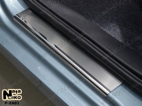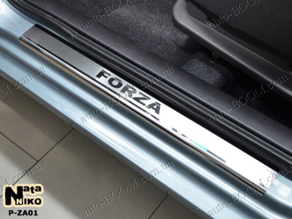 Накладки на пороги ЗАЗ Forza 11-, в комплекте 4 штуки. По желанию клиента их можно покрыть карбоновой пленкой. Эта услуга совершенно бесплатна. Данные аксессуары производятся фирмой NataNiko из высоколегированной нержавеющей стали, которую они получают от мировых производителей. Толщина накладки на пороги составляет 0,5 мм. Для их надежного и долговечного крепления используется двухсторонний скотч ЗМ. Он уже нанесен по внутреннему периметру.