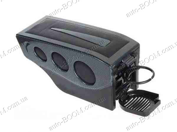 Подлокотник универсальный Vitol 48013 карбон имеет пластиковый каркас, а в качестве ткани используется автомобильный кожзам. Размеры: