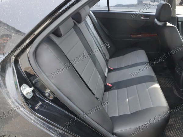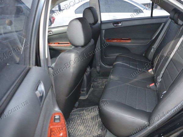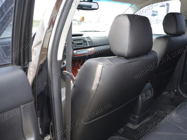 Автомобильные чехлы из экокожи Toyota Camry 30 01-06 производятся украинской компанией Союз-Авто, пошиты из высококачественного экологически чистого кожзаменителя Аригон и экокожи. Данный материал легко поддается чистке обычными чистящими средствами, имеет отличную вентилируемую функцию. Из характеристик авточехлов следует выделить то, что задняя часть и передняя спинка закрыта, одевается мешком без резинок. Крепление осуществляется с помощью липучек на задние и передние спинки, а сведение крепится с помощью веревки. В подголовниках имеются специальные отверстия.