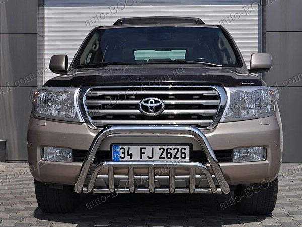 Кенгурятники на Toyota Land Cruiser 200 08- из нержавеющей качественной стали производство St-line (Турция). Такая конструкция состоит из спаянных труб и стержней. Крепятся в основном спереди, но реже сзади автомобиля. Предназначения кенгурятников в наше время, как защита кузова при езде по бездорожью. При неожиданном столкновении они уменьшат или смягчат удар от повреждения и деформации автомобиля. Кенгурятники служат не только, как защита, но и как прекрасный аксессуар для вашего авто, придавая солидный привлекательный внешний вид. Чаще всего используют такой аксессуар для джипов, микроавтобусов, пикапов. Купить и забрать данный товар на автомобиль Тойота Ленд Крузер 200 можно у нас в магазине лично или с доставкой по Украине.