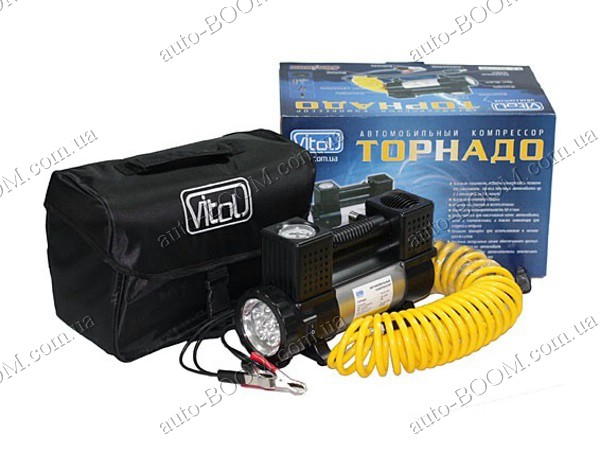 Автомобильный компрессор Торнадо КА-Т12191 мощный и надежный компрессор со встроенным фонарем. Наличие гибкого витого шланга позволяет обходиться без переноски компрессора от колеса к колесу при накачке, защитная система автоматически отключает питание при перегрузке.