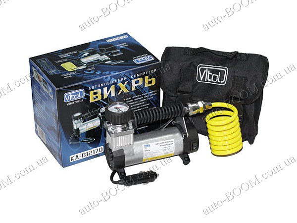 Автомобильный компрессор Вихрь КА-В12170 в металлическом корпусе для использования в автомобиле и в быту. Быстро накачает колесо легкового автомобиля, велосипеда, надувную лодку. Пригодится для любителей активного времяпрепровождения при накачке инвентаря для спорта и отдыха. Мощный роторный мотор, надежность и простота в использовании, высокая продуктивность в небольшом размере - 27 литров в минуту, защитная система автоматического отключения питания при перегрузке, колесо 12-15 радиусов накачивает до 3 атмосфер за 8-10 минут, удобная тканевая сумка-чехол для транспортировки.