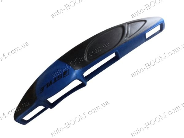 Накладка на торпеду ЗАЗ Таврия синяя изготовлена фирмой Probass. Она идеально повторяет форму панели и крепится на силикон. Накладка на торпедо служит отличным аксессуаром для тюнинга салона. Хотя на первый взгляд это может показаться незначительным изменением, однако все состоит из мелочей и особенно это заметно, когда родная панель уже потеряла свой внешний или ее черный цвет просто надоел. Она изготовлена из пластика и перетянута кожзаменителем. Что касается материала основы, то лучше не оставлять автомобиль под открытым солнцем на жаре, так как данный аксессуар может незначительно изменять свою форму при высоких температурах. Материал обивки качественный и практичный, что значительно повышает срок службы накладки на торпеду.